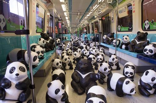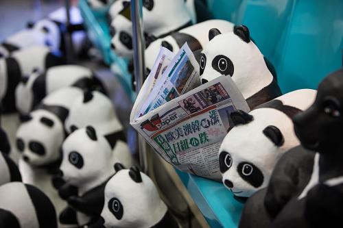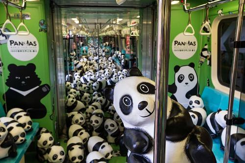 3月14日,纸雕大熊猫搭乘台北捷运地铁。新华社发(吴景腾 摄)