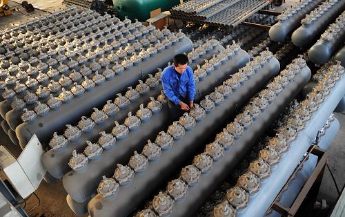 3月15日,河北高科环保集团有限公司工人在安装气包脉冲阀。近年来,河北省泊头市依托工业基础,大力发展环保设备产业。截至目前,全市有环保设备企业106家,产品形成高压静电、旋风等13大系列,200多个品种。其中,具整机生产能力的企业45家,从业人员1.3万人,年产值40多亿元。全市拥有全国百强环保企业2家,专利70多项。新华社发(牟宇 摄)