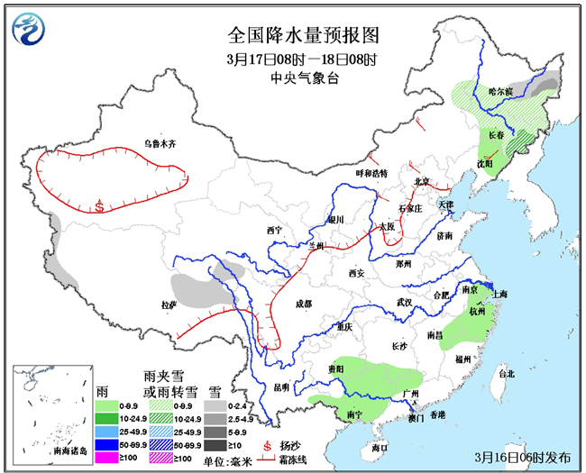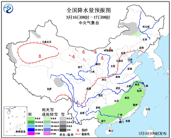 16~17日,冷空气继续东移影响西北地区中东部、内蒙古、华北、东北等地,上述地区先后有4~8℃降温,并伴有4~6级偏北风,南疆盆地、甘肃西部、内蒙古中西部等地有扬沙或浮尘天气,18日又将有一股冷空气开始影响内蒙古地区。16~18日,暖湿气流较活跃,江南、华南等地多阴雨天气,以小到中雨为主,江南中北部局地有大雨。 未来三天具体预报 16日08时至17日08时,内蒙古东北部、新疆西部等地的部分地区有小雪或雨夹雪;江淮南部、江南西南部和中东部、贵州南部、广西、广东大部等地有小到中雨。此外,南疆盆地、甘肃西部、内蒙古中西部等地有浮尘或扬沙。甘肃西部、内蒙古中西部等地有4~6级风。 17日08时至18日08时,黑龙江东部和南部、吉林、辽宁中北部、西藏西南部和东北部等地有小到中雪或雨夹雪;江南东北部和西南部、广西、广东北部、贵州南部等地有小雨。内蒙古中东部等地有4~5级风。 18日08时至19日08时,内蒙古中东部、华北北部、西藏西南部等地有小雪或雨夹雪;黄淮中西部、江淮、江汉、江南大部、广东北部、广西中北部、西南地区东部等地有小到中雨,局地有大雨。甘肃西部、内蒙古中东部、华北北部有4~5级风。 |