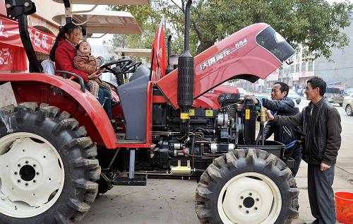 3月17日,在江西乐平市农机局大院内,工作人员为享受国家农机具补贴的崭新拖拉机验机。入春以来,乐平市农机局及时充足资金,为农民购置农机具提供有效补贴。截止到3月16日,该市已补贴金额244多万元,帮助334户农民购置农具645台。乐平市今年安排国家农机具补贴资金逾1500余万元,纳入补贴的拖拉机、水稻插秧机、联合收割机等农机具囊括12大类、共85个产品。新华社发(朱定文 摄)