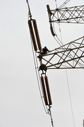 3月17日,工作人员在河北省秦皇岛市卢龙县对220千伏官(陈官屯)荆(上荆子)线进行检修。新华社发(杨建校 摄)