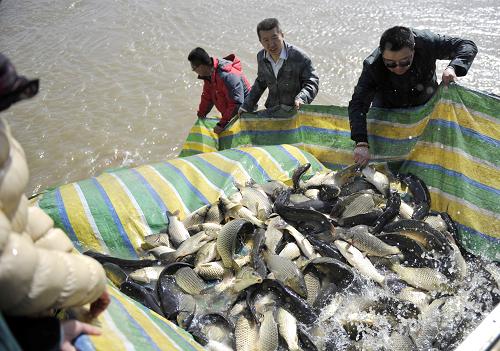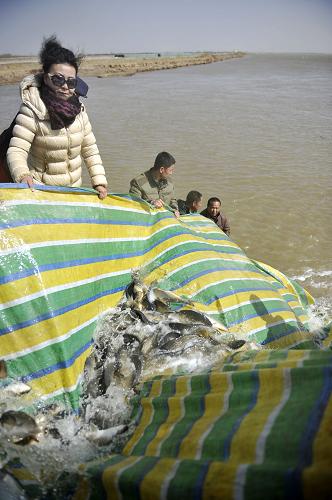 3月19日,市民在黄河宁夏银川贺兰段放生鲤鱼。新华社记者 王鹏 摄