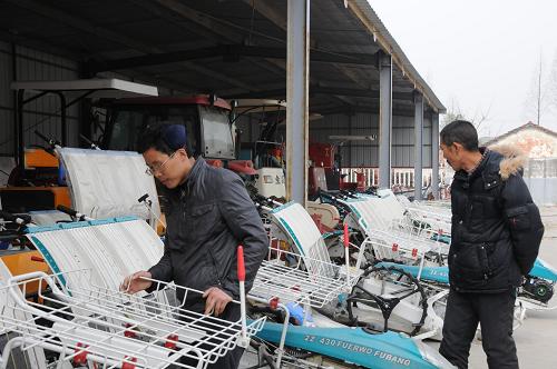 沙洋县曾集镇农民在镇里的五洋农机合作社选购插秧机(3月17日摄)。“买台插秧机有多少补贴,合作社哪天搞农机培训……”菜花黄,备耕忙。3月17日,湖北省沙洋县曾集镇五洋农机合作社大院非常热闹,从十里八村赶来的20多位村民围着农机技术员蔡代贵问这问那,他们都是来买插秧机的。新华社记者 王贤 摄