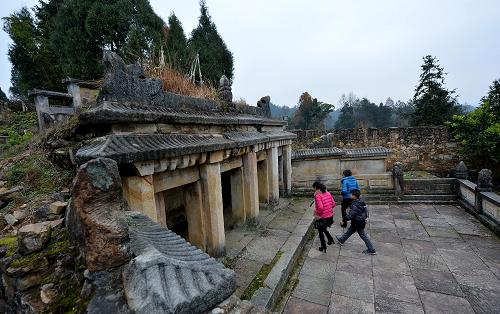 游人在湖北省咸丰县唐崖土司城遗址内的土司坟参观(2013年12月14日摄)。新华社发(宋文 摄)