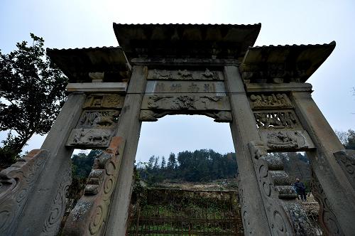 湖北省咸丰县唐崖土司城遗址内的石牌坊(2013年12月14日摄)。新华社发(宋文 摄) |