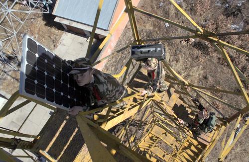 3月25日,武警黑龙江省大兴安岭森林支队官兵在大兴安岭加格达奇林业局东山瞭望塔上安装天线。新华社记者 王齐胜 摄