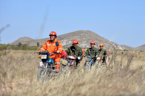 3月26日,呼和浩特市赛罕区的几名护林防火队员骑着摩托车在大青山南坡榆林镇的树林中巡逻。新华社记者 任军川 摄