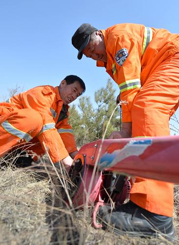 3月26日,呼和浩特市赛罕区护林防火队员高有贵(右)和康二全正在检修风力灭火机。新华社记者 任军川 摄