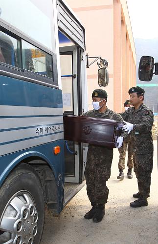 3月27日,在位于韩国京畿道坡州市的中国人民志愿军遗骸临时安置所,韩国士兵将装着遗骸的棺椁起运装车。 新华社记者 姚琪琳 摄 |