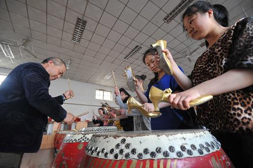 3月26日,在山西省运城市新绛县新华学校,学生们向绛州鼓乐团的老师(左)学习绛州鼓乐。新绛古称绛州,是绛州鼓乐、绛州澄泥砚、绛州皮影、绛州木版年画等国家级、省级非物质文化遗产荟萃之地,2013年被教育部确定为全国农村学校艺术教育实验县。近年来,该县充分利用当地丰富的艺术资源,在农村全面推广非物质文化遗产进校园系列活动,为农村学生提供了在校园里体验和传承非遗文化的机会。新华社发(高新生摄)
