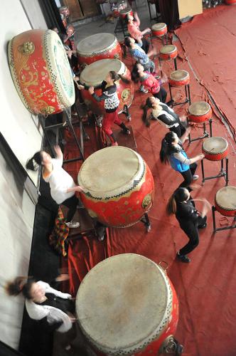3月26日,在山西运城市新绛县新华学校,学生们在练习绛州鼓乐。新华社发(高新生摄) |