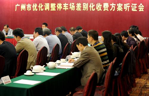 3月28日,广州召开优化调整停车场差别化收费方案听证会。当日,广州召开“优化调整停车场差别化收费方案”听证会,在两套涨价方案中让听证代表做出选择,停车费“大幅涨价”引起巨大争议。在两套听证方案中,住宅停车最高可能涨300%、咪表停车最高可能涨150%、商场停车最高可能涨100%、“15分钟”计费……听证代表们对停车费涨价是否合理、停车费收入到底去哪儿了、涨价是否能够治理交通拥堵、事关群众切身利益的停车费涨价到底谁说了算等诸多问题提出质疑。新华社记者 刘大伟 摄