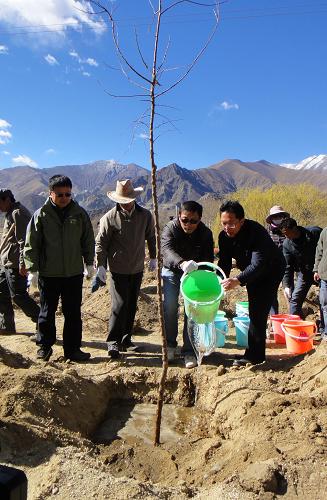 3月29日,援藏干部在拉萨市堆龙德庆县羊达乡通嘎村义务植树。当日,西藏自治区党委组织部和区林业局共同主办“2014年第七批援藏干部义务植树活动”,共有190余名援藏干部参加活动,共种植苗木500余株。新华社记者 安娜 摄