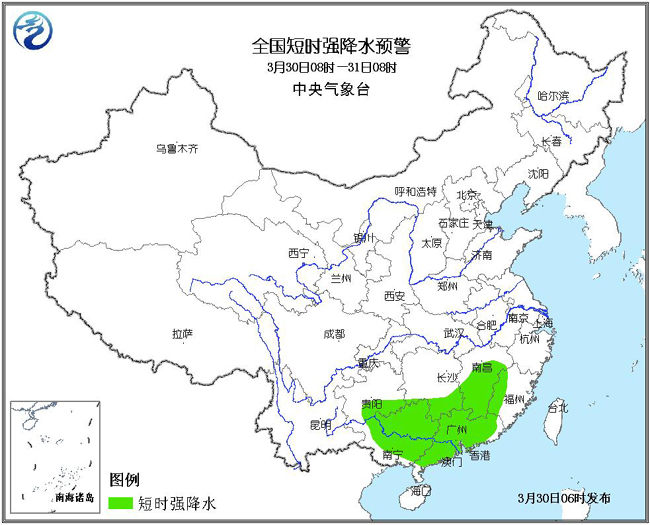 预计,30日08时至31日08时,贵州东南部、湖南南部、江西中南部、福建西部、广西和广东等地的部分地区将有短时强降水天气,湖南南部、江西南部、广西中东部和广东中西部等地的局部地区伴有雷雨大风或冰雹天气。
