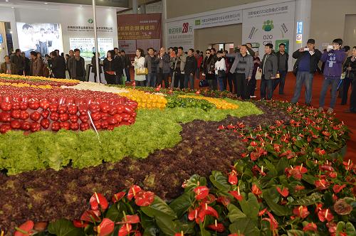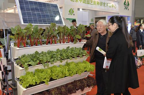 3月28日,参会者在农博会观看赤峰和润农业高科技产业开发有限公司的高新蔬菜花卉品种。新华社发(马天烈 摄)
