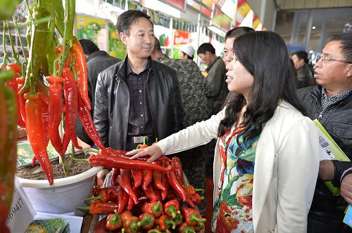 3月28日,参会者在农博会上观看天津朝研种苗科技有限公司培育的新品种冬胜2号大羊角椒,这种辣椒平均单果重125至170克,适合越冬、早春温室栽培。新华社发(马天烈 摄)