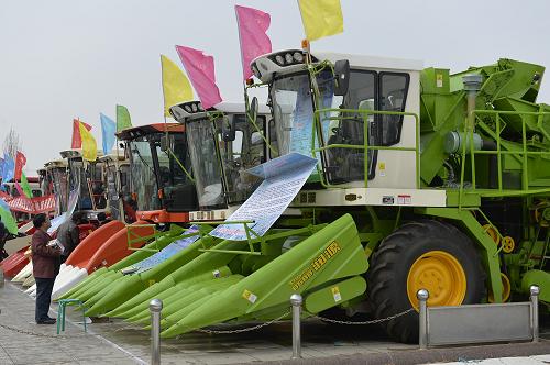 3月28日,参会者在农博会上观看展出的大型收割机。新华社发(马天烈 摄)