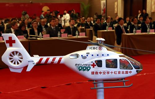 3月31日,一架专业救援直升机模型亮相北京市红十字会999急救中心与欧洲直升机公司签约仪式。当日,北京市红十字会999急救中心与欧洲直升机公司共同签署直升机紧急医疗服务合作协议,双方就首都直升机空中医疗救援服务开展长期合作。仪式上,999急救中心与欧洲直升机公司签约购进2架欧直医疗急救专用直升机,首架直升机将于2014年8月到京。999急救中心将通过选派专业医务人员前往欧洲进行培训学习和请国外直升机救援机构专家来北京对999全体急救医务人员进行培训的方式,提高空中医疗救援能力。新华社记者 李明放 摄