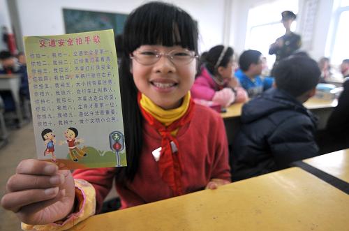 3月31日,浙江省台州市玉环县干江镇中心小学的学生展示干江边防派出所民警赠送的《交通安全拍手歌》宣传卡片。当日是第19个“全国中小学生安全教育日”,今年的主题是“强化安全意识,提升安全素养”。多地中小学校组织学生开展紧急疏散、应急救护、安全防范等多种安全教育活动,提升学生的安全防范意识和自我保护能力。新华社发(郏策 摄)