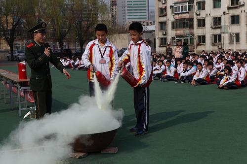 3月31日,沈阳市第一二六中学的学生在消防员的指导下体验灭火器灭火。新华社发(赵敬东 摄)