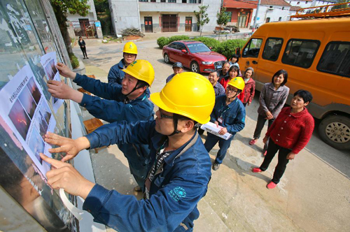 4月4日,国网浙江金华供电公司工作人员在金华澧浦镇南宅村向当地群众宣传保护电力设施常识。日前,浙江省首部地方性电力法规《浙江省电网设施建设保护和供用电秩序维护条例》经浙江省第十二届人民代表大会常务委员会第九次会议审议通过,自2014年7月1日起施行。新华社发(王平 摄)