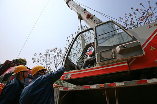 4月4日,国网浙江金华供电公司工作人员在浙江金华澧浦镇提醒施工人员高压线下起吊苗木的安全距离。新华社发(王平 摄)