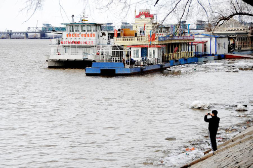 4月5日,在开江的松花江哈尔滨城区段的江畔,市民在拍摄江景。哈尔滨水文部门近日确定,今年4月初松花江哈尔滨城区段的开江,创下了近12年来最早纪录。据了解,松花江哈尔滨城区段历年平均开江日为4月9日。松花江“春来早”,吸引了不少游人聚集在沿江风景区,观赏松花江开江的壮阔景致。新华社记者 王建威 摄