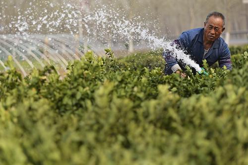 山东邹平县好生街道世纪花卉苗木专业合作社农民在管理苗木(4月1日摄)。随着春耕春管的逐步展开,山东邹平县农村的家庭农场、专业合作社、专业户、农业产业化龙头企业、农业示范园区等新型经营主体渐成春季生产的主力。这些经营主体的广大农民抓住春季有利时机进行春播、春灌、春耕,为夏季丰收打下良好基础。目前,该县建有46家示范园,登记注册的农民专业合作社292家,家庭农场37家,农业产业化规模企业114家。据农业部统计,截至目前,全国约四分之一的承包地主要流转到种粮大户和家庭农场等新型经营主体手里。新型经营主体正在成为春耕生产的主角。新华社发(董乃德 摄)