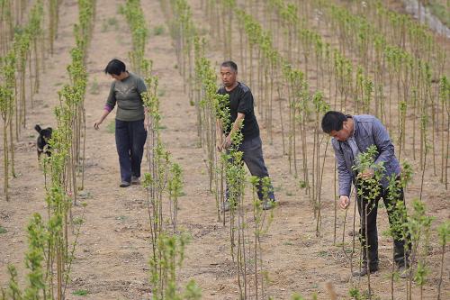 山东邹平县西董街道张家洞村园艺专业合作社农民在管理海棠树苗,该合作社海棠种植面积达到600余亩(3月31日摄)。新华社发(董乃德 摄)