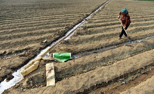4月9日,山东邹平县明集镇西宋村绿宝来蔬菜种植专业合作社农民在农场浇葱苗。该农场面积830亩,是蔬菜加工厂对接种植基地。新华社发(董乃德 摄) |