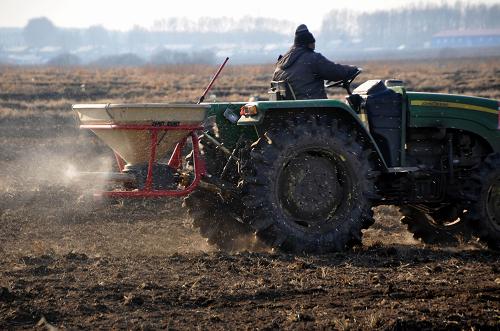 4月9日,职工驾驶机车在黑龙江垦区建设农场水稻管理区稻田地里机械撒肥。新华社发(周良君 摄)
