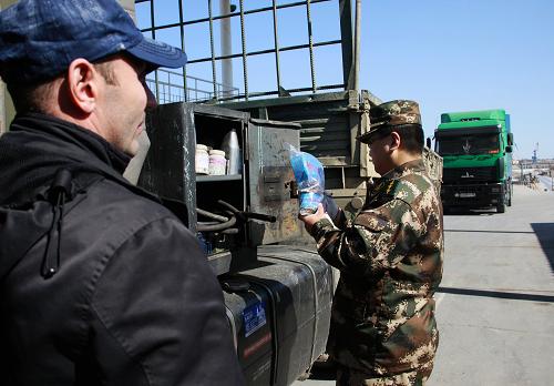 4月10日,边检官兵检查入境的俄罗斯货车。新华社发(刘松 摄)