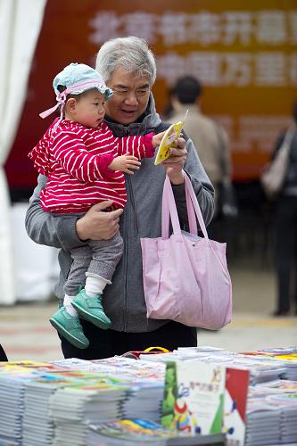 4月11日,一名读者带着小朋友在2014北京书市上选购图书。新华社发(赵冰 摄)