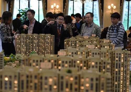 4月12日,购房者在河北涿州市某楼盘销售中心查看住宅沙盘。据房产销售人员介绍,来自北京的顾客占到八成左右。新华社记者 王晓 摄 |
