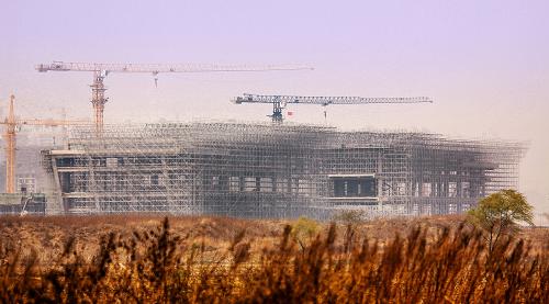 4月14日,一辆列车经过正在建设的沈阳新南站西站房。日前,可同时容纳9000人候车的沈阳新南站东西两个站房建设已经封顶,东广场地上、地下主体基本完工。沈阳新南站总建筑面积30万平方米,预计2015年投入使用。新华社记者 姚剑锋 摄