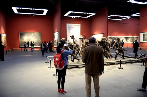 4月15日,观众在观看画家韦辛夷创作的重大历史题材国画作品《闯关东》。近日,山东美术馆推出“山东省重大历史题材美术创作工程”入选作品展览,展出国画、油画、版画、雕塑等作品60余件,作品艺术地再现波澜壮阔的齐鲁文化和山东的重大历史事件。新华社记者 冯杰 摄