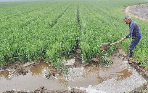 4月15日,山东省滨州市邹平县临池镇农民在田间浇灌小麦。山东省防办、山东省农业厅等部门近日发布的信息显示,2014年以来,山东省降水持续偏少,多地出现不同程度干旱。截至目前,全省926万亩在田作物出现不同程度干旱,占总播种面积的12.05%,有部分地区小麦受此影响出现抽穗、黄稍现象。山东各地已掀起抗旱保麦保春播攻坚战。新华社发(董乃德 摄)