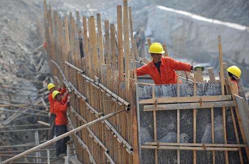 4月15日,施工人员在冷木沟泥石流综合治理工地上修筑排导槽。“4·20”芦山地震发生后,多次遭遇泥石流灾害的宝兴县冷木沟出现多处崩塌、滑坡等灾害隐患,成为芦山地震灾区威胁最大的一条泥石流沟,严重威胁县城安全。为消除隐患,当地正在加紧进行冷木沟泥石流综合治理工程,预计5月底前可全部完工。新华社记者 薛玉斌 摄