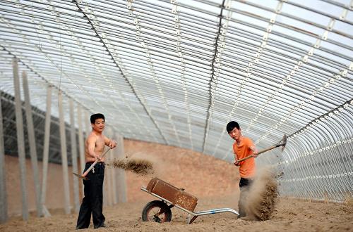 4月16日,河北省大城县宫村农民在节能蔬菜大棚里为土壤施有机肥料。新华社记者 李晓果 摄