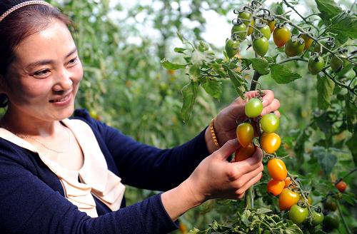 4月16日,河北省大城县宫村农民在采摘大棚樱桃西红柿。新华社记者 李晓果 摄