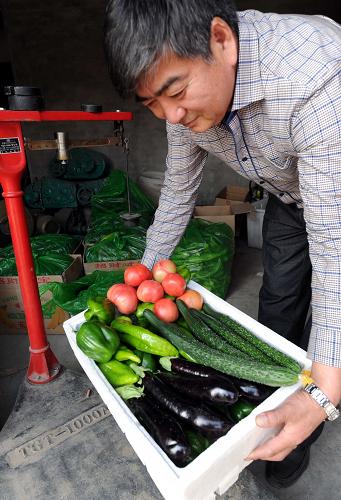 4月16日,河北省大城县宫村农民在为有机蔬菜称重。新华社记者 李晓果 摄