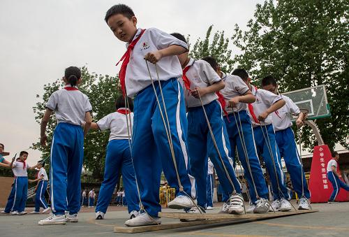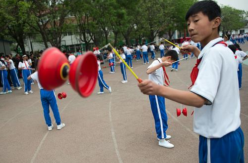 4月16日,十八里店小学的学生在进行抖空竹表演。当日,2014年北京市中小学奥林匹克教育系列活动在朝阳区十八里店小学启动。2014年北京市中小学奥林匹克教育系列活动以“奔跑、运动、成长”和“支持申办冬奥,实现中国梦想”为两大主线,整合北京市教育和体育系统青少年体育赛事资源,开展30多项奥林匹克教育系列活动。内容既包括中小学校园篮球、智力运动、民族传统体育、“我的奥林匹克”青少年体验营等传统项目,也包括足球体育教师培训、校园足球赛、“奥城杯”青少年足球冠军杯、家庭足球嘉年华等足球主题类活动。新华社记者 张宇 摄