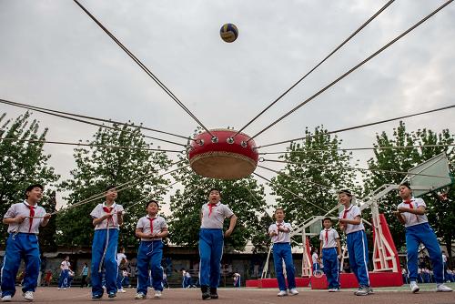 4月16日,十八里店小学的学生在进行齐心协力鼓游戏。新华社记者 张宇 摄