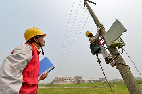4月18日,在湘潭市姜畲镇清亭村,保电小分队的工作人员在电线杆上接线。新华社记者 白禹 摄