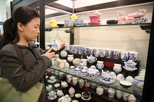 4月18日,观众在第四届中国国际茶业及茶艺博览会上观赏手绘茶具。新华社发(陈晓根 摄)