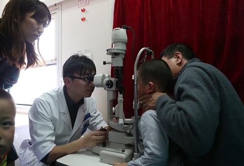 4月19日,在“健康快车”火车医院,北京大学人民医院的眼科医生在为儿童检查眼睛。 当日,市民参观“健康快车”火车医院活动在北京举行。这次开放的“健康快车”火车医院由4节车厢组成,包括手术室、病房、消毒室、会议室等眼科医院运行的必备部分。一列火车医院一年可救治贫困白内障病患3000多人。除了参观火车医院,即将随车出发的北京大学人民医院的眼科专家还为参观者免费做视力、眼压 、眼底检查和眼病答疑。 “健康快车”是香港同胞为内地捐赠的火车流动医院,专门为内地贫困白内障患者提供免费治疗。“健康快车”成立17年来,已开赴全国133个地方,为超过14万名白内障患者免费实施了复明手术治疗。新华社记者 王申 摄