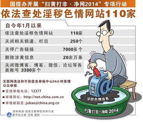 图表:国信办开展“扫黄打非·净网2014”专项行动 依法查处淫秽色情网站110家 新华社记者 冯琦 编制