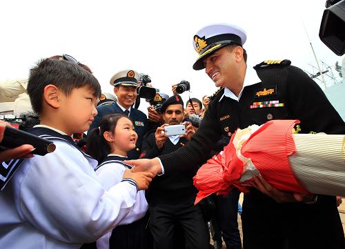 4月20日,青岛市小朋友向巴基斯坦海军“沙姆谢尔”号护卫舰舰长扎法尔上校献花。 新华社记者 查春明 摄