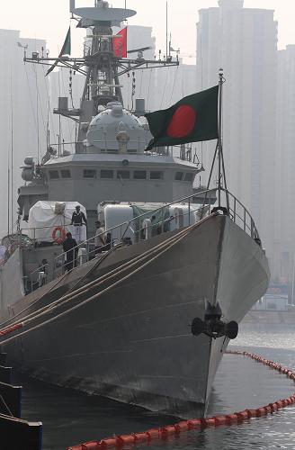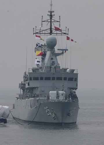 4月20日,抵达青岛大港码头的孟加拉国“阿布·巴卡尔”号护卫舰停泊在港口。新华社记者 王建民 摄