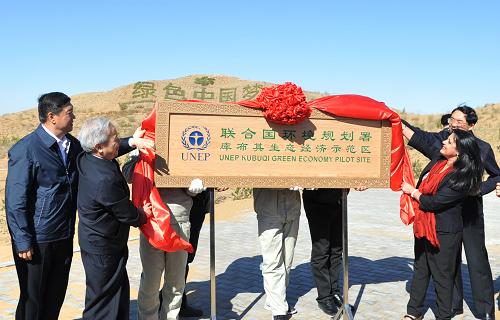 4月22日,嘉宾在库布其沙漠为“生态经济示范区”揭牌。